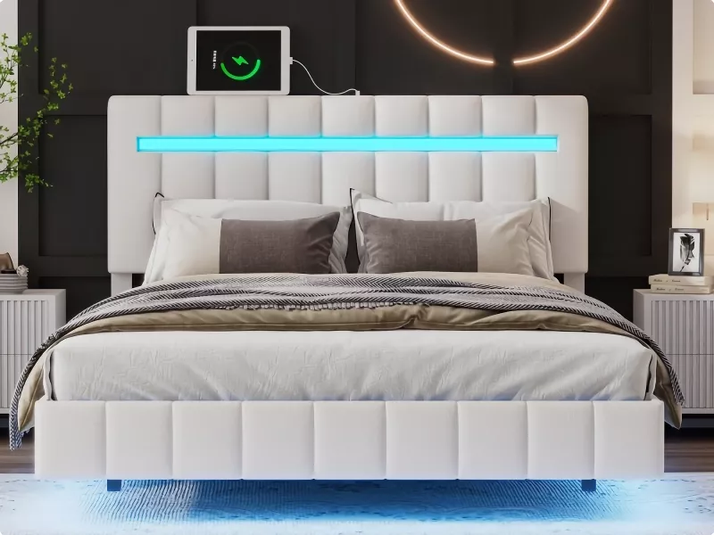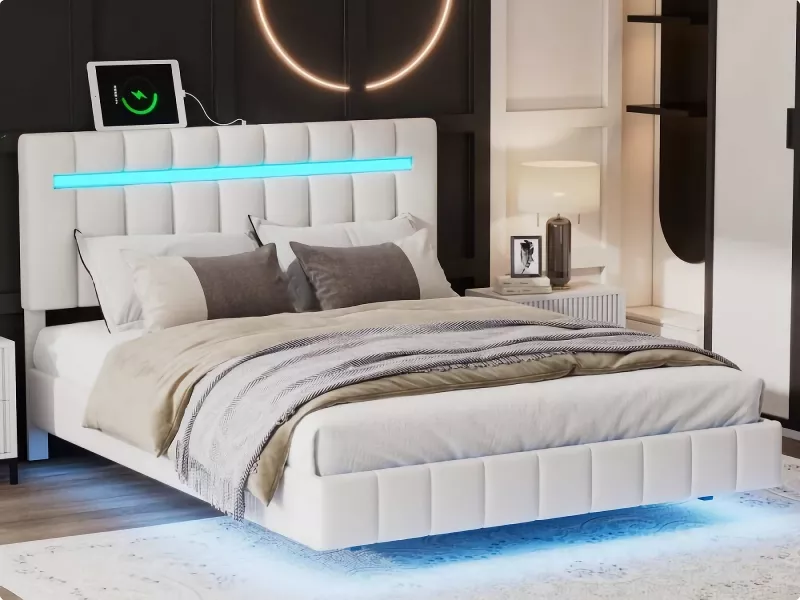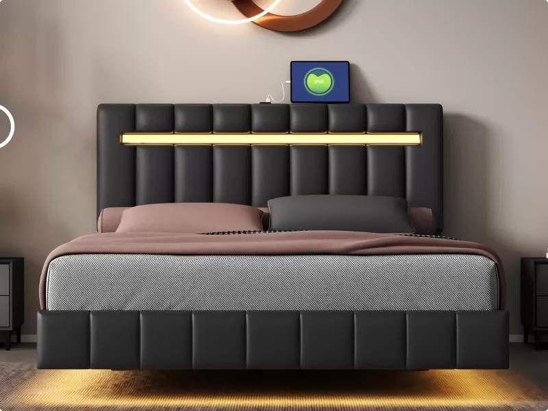 What sets this bed apart is its unique floating design combined with modern LED lighting and practical USB charging. It’s not just a bed frame; it’s a lifestyle upgrade. It’s designed for those who appreciate both style and functionality in their furniture. Embrace the future of bedroom design with our Modern Queen Size LED Upholstered Platform Bed Frame. Transform your bedroom into a sanctuary of modern comfort and style today! Don’t wait to experience the ultimate in bedroom luxury. Click to add to cart and bring home the future of sleep and style!